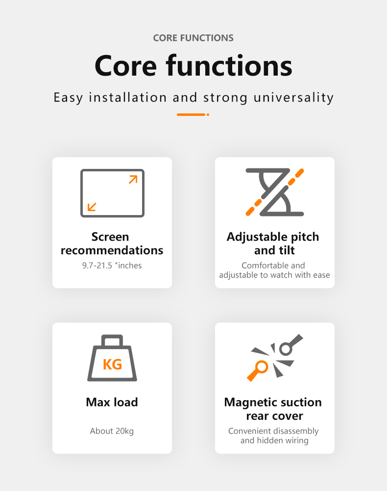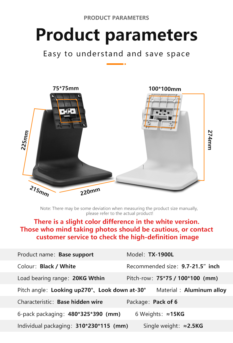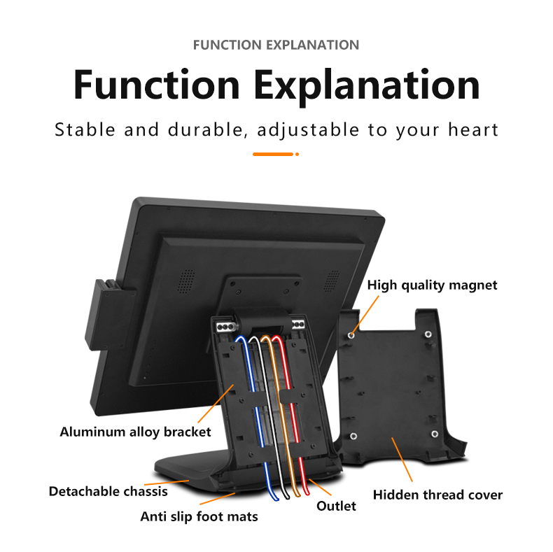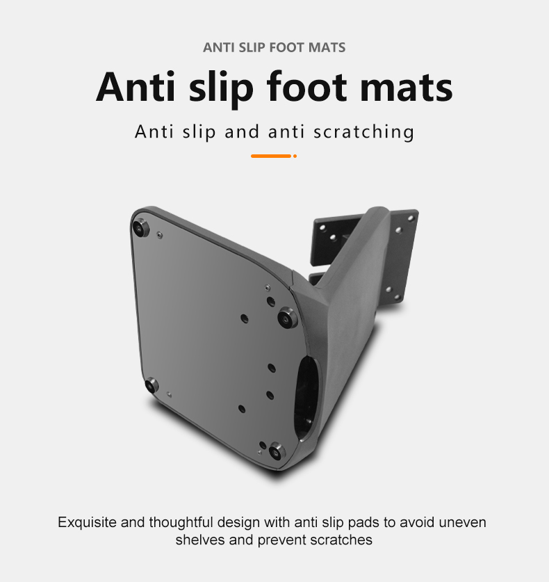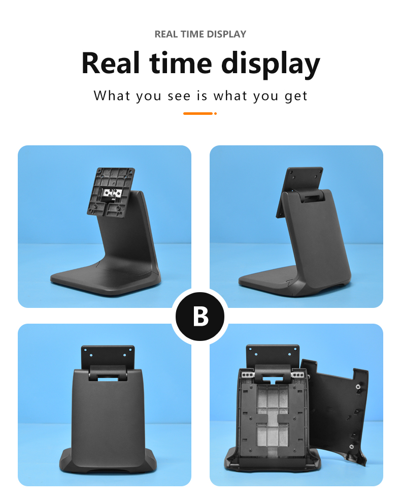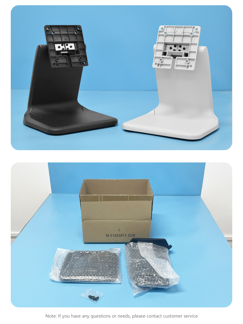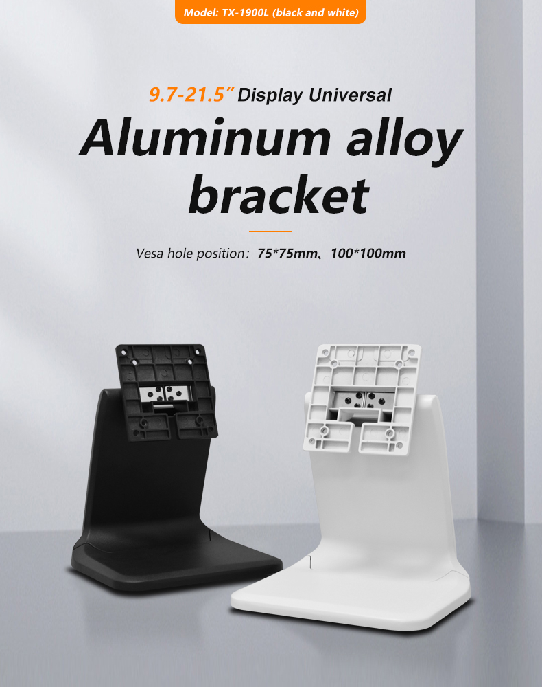 Aluminum alloy shell, with beautiful and unique design, durable and long-lasting, extending product life. The base is stable and perfectly matches the touch screen. The base can be screen printed with your logo to create a unique brand image. Standard VESA hole position 75 * 75/100 * 100mm Supporting monitor sizes: 9.7/12/13.3/15/15.6/17/17.3/18.5/19/2.15/23.8inches
