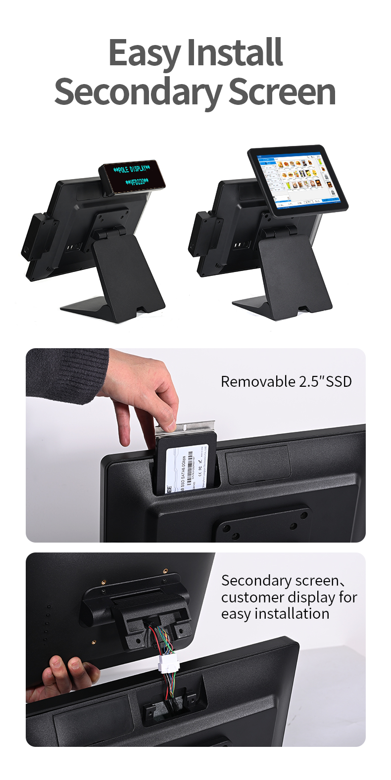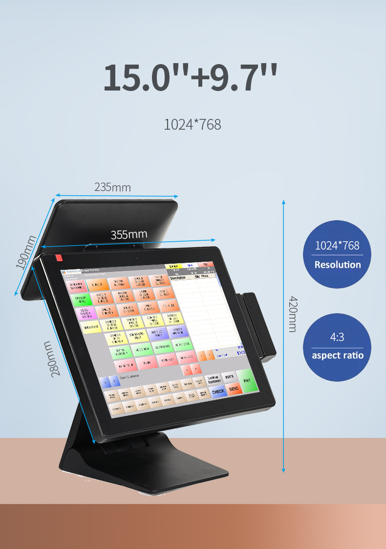 The 15-inch dust-proof display ensures clarity, and the aluminum alloy housing provides robust protection. The foldable stand makes transportation and storage a breeze, while also reducing shipping costs by 30%. Adding a secondary screen is simple, enhancing your POS capabilities.