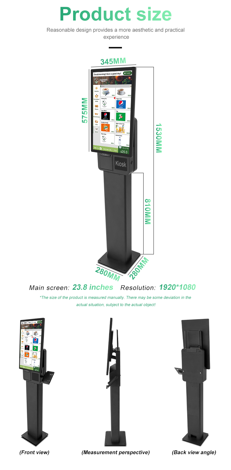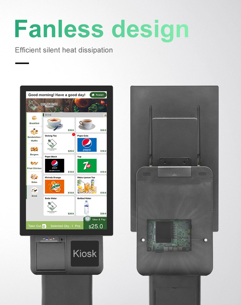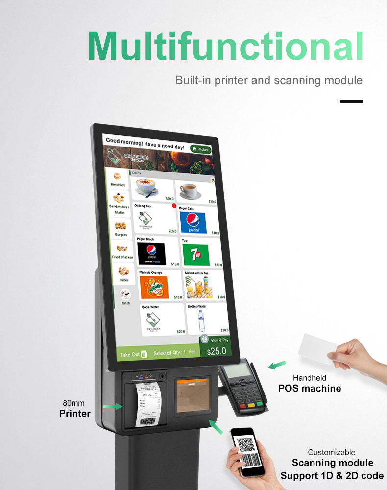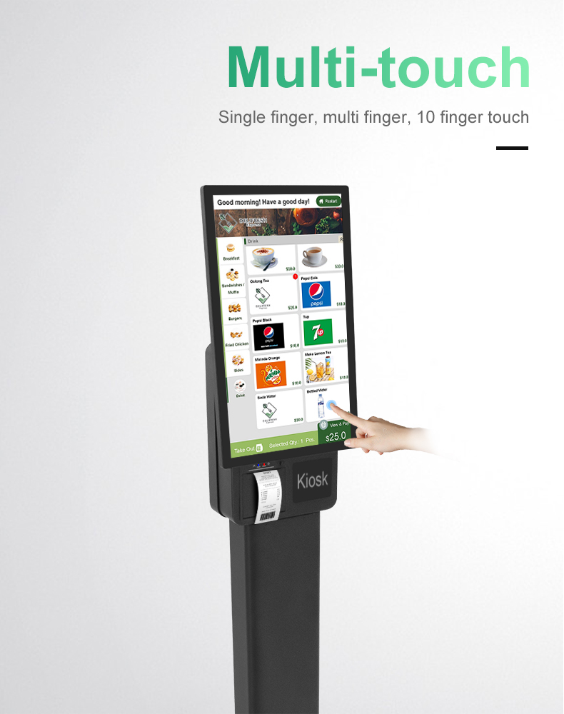 A floor standing 23.8-inch single screen dual screen integrated self-service cash register suitable for self-service scenarios such as KFC/McDonald's, with wall mounted screen size that can be switched and placed on a desktop